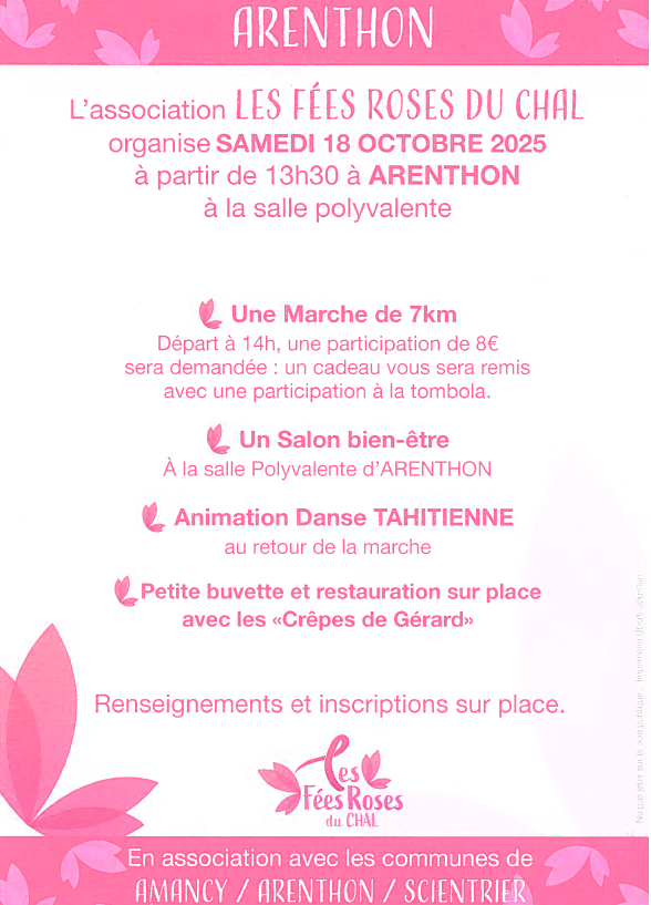 En association entre les communes d’Amancy / Arenthon / Scientrier, l’association les fées roses du CHAL organise le Samedi 18 Otobre 2025 à partir de 13h30 à la salle polyvalente d’Arenthon :